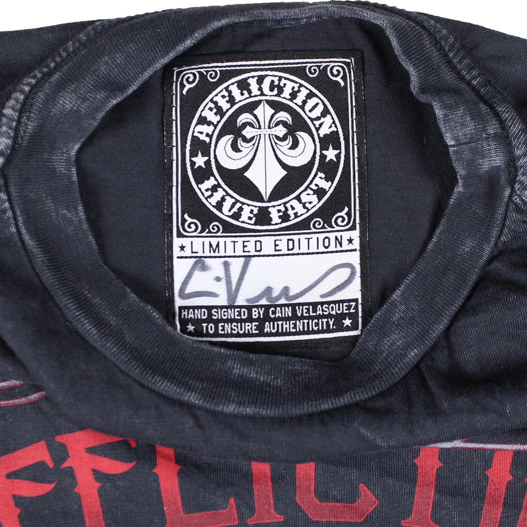 Affliction Youth Cain Velasquez Caudillo Shirt is hand-signed by Cain Velasquez, and is the official UFC 188 walkout shirt of UFC heavyweight, Cain Velasquez!
