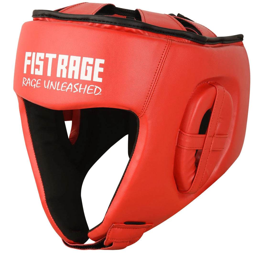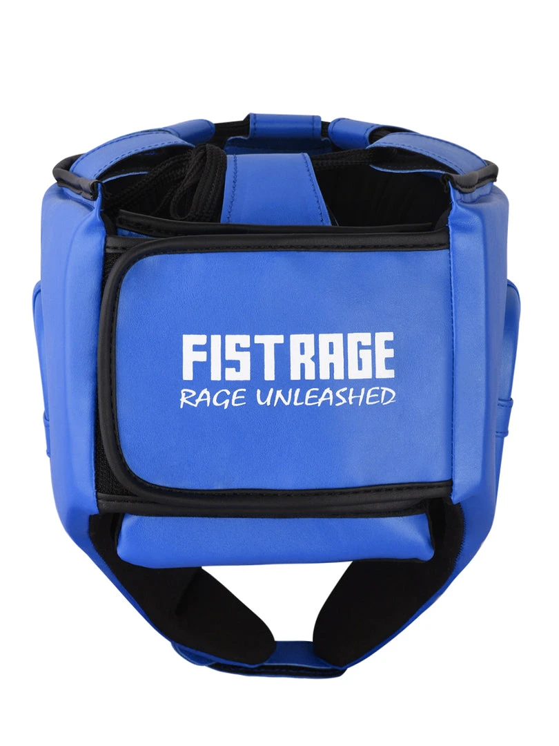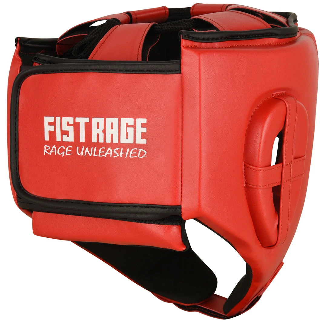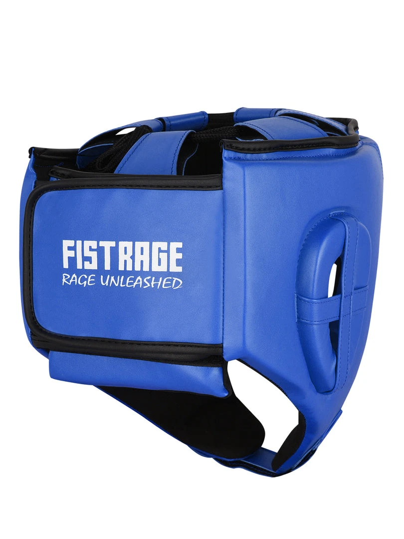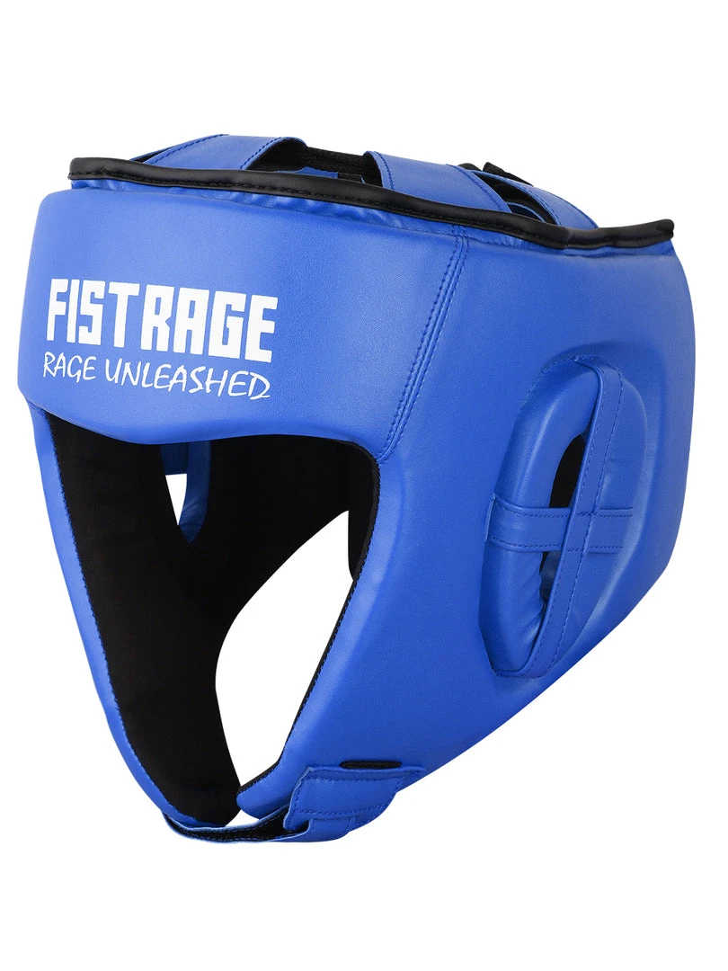 FISTRAGE Boxing Headgear made with Premium quality leather with anti-slip leather lining. Calibrated impact diffusion sheet makes boxing headgear durable its multiple layers of foam with gel in-lining serves as added shock absorber. Shredded pulp from EVA padding, Max shock sheet and Zerox fabric with stuffed hosiery waste makes for perfect shock absorption of this headgear. It is a very light weight head guard with air cushion foam padding inside to keep your head safe during fights. FISTRAGE boxing headgear comes with strong Velcro strap back closing made up of leather.